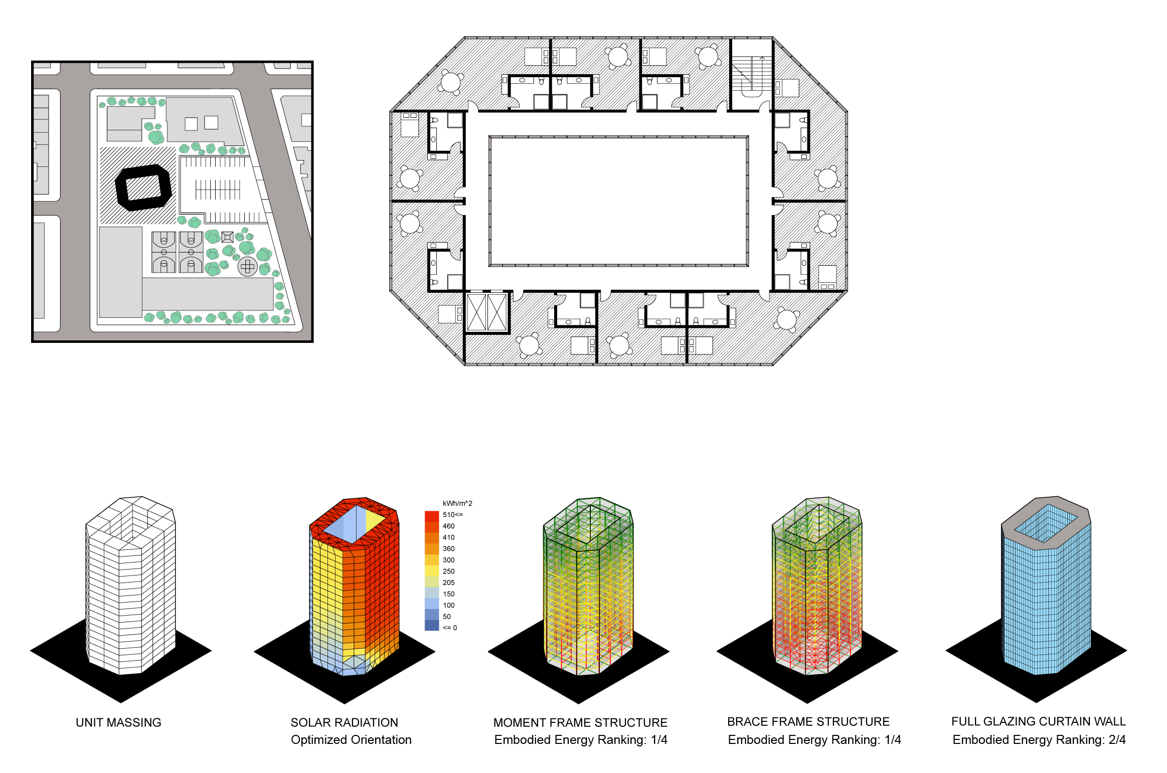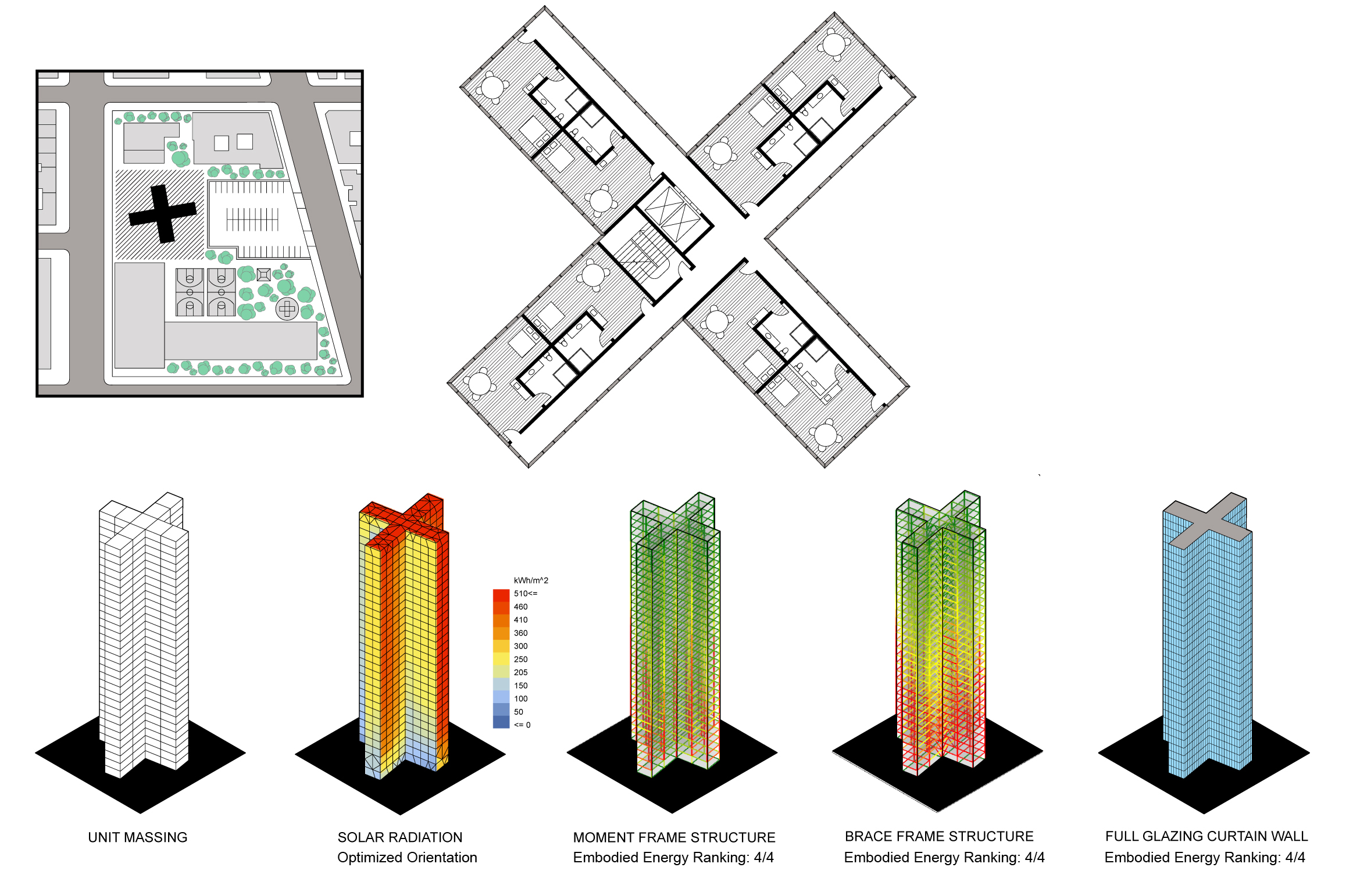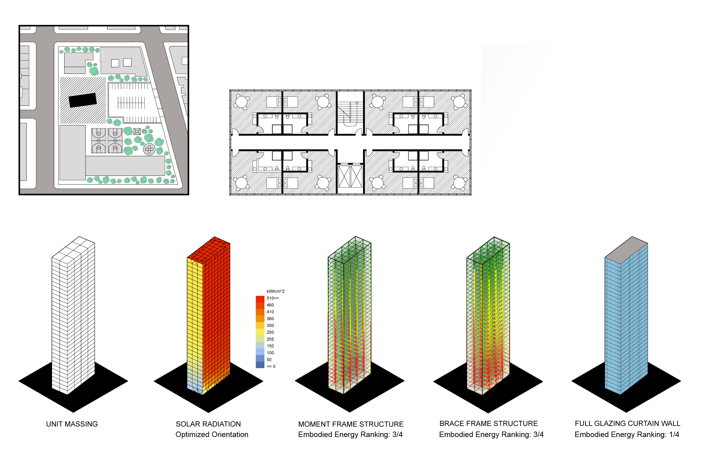 OpTowers is a system to generate schemes for the initial design phase given consideration to embodied energy of materials and building operation energy efficiency. An optimization workflow was implemented to minimize steel embodied energy and maximize solar radiation. A typical housing project in New York City was studied and used to define the site and program parameters. Scheme massing and orientation was determined by site, program, and solar parameters. Two structural strategies (moment frame and brace frame) and one façade strategies (full glazing curtain wall) were applied and/or optimized to each scheme. The catalogue of tower schemes serves as a reference for the preliminary design of energy-conscience structures.