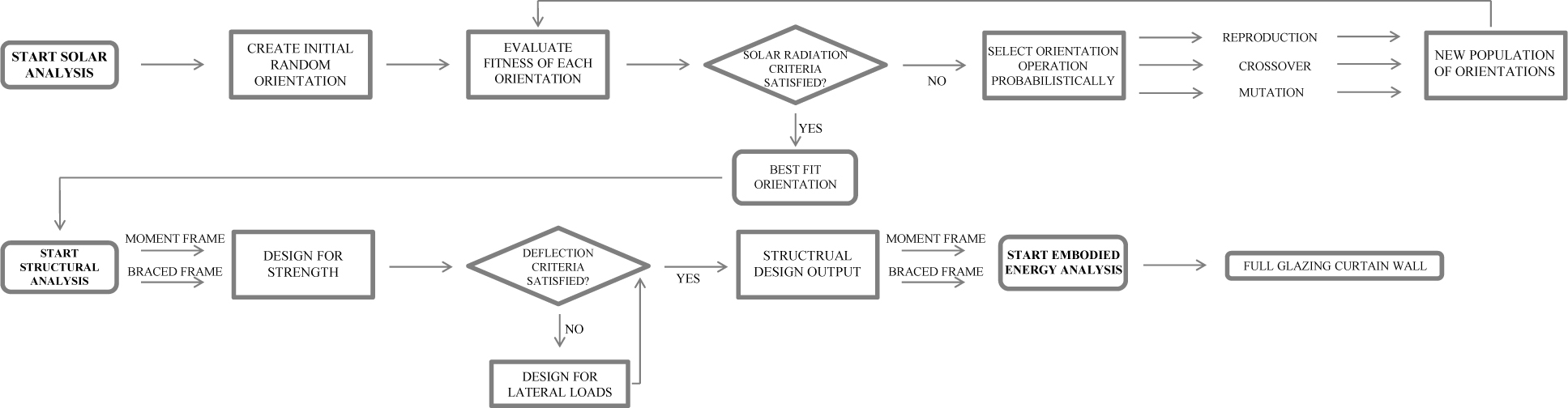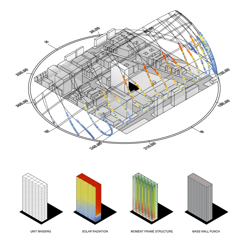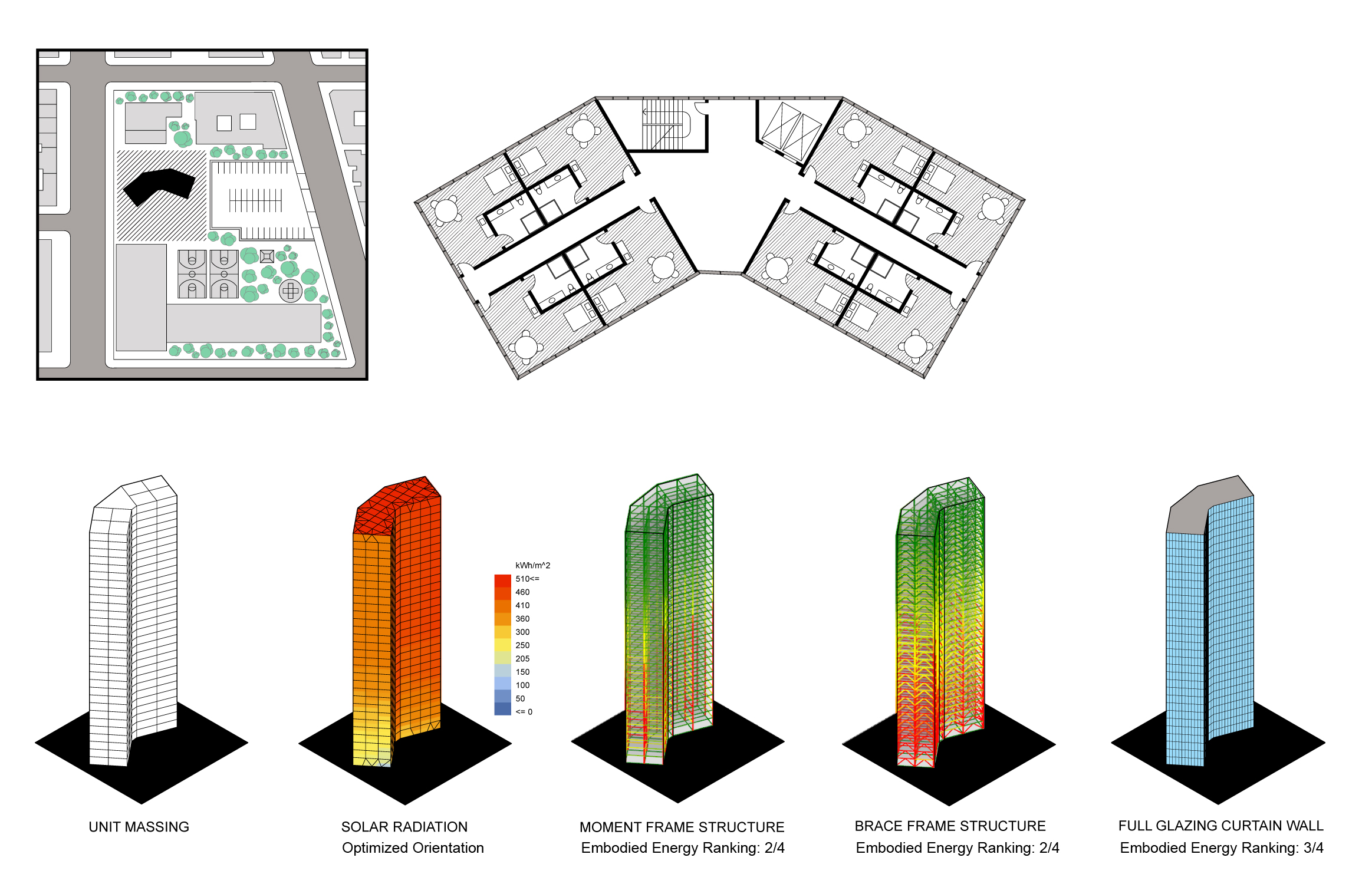 OpTowers is a system to generate schemes for the initial design phase given consideration to embodied energy of materials and building operation energy efficiency. An optimization workflow was implemented to minimize steel embodied energy and maximize solar radiation. A typical housing project in New York City was studied and used to define the site and program parameters. Scheme massing and orientation was determined by site, program, and solar parameters. Two structural strategies (moment frame and brace frame) and one façade strategies (full glazing curtain wall) were applied and/or optimized to each scheme. The catalogue of tower schemes serves as a reference for the preliminary design of energy-conscience structures.
